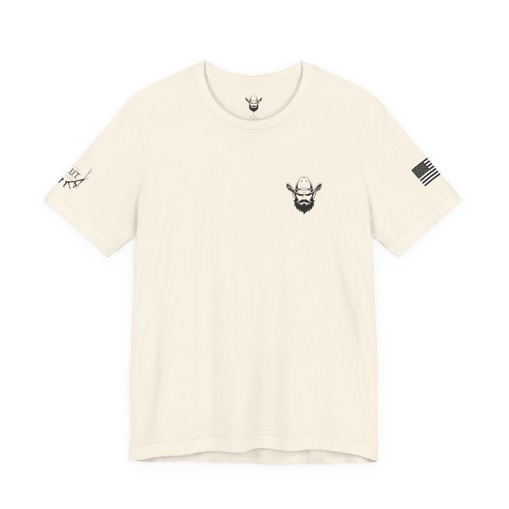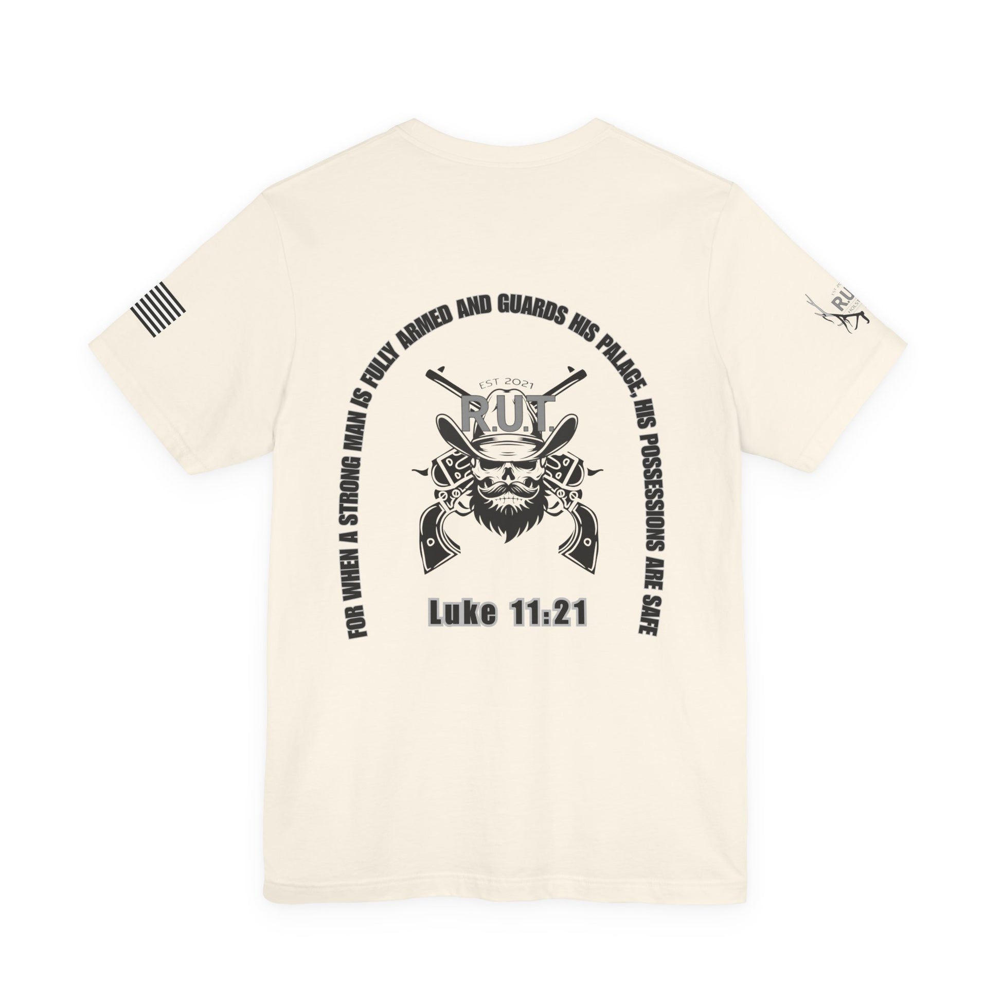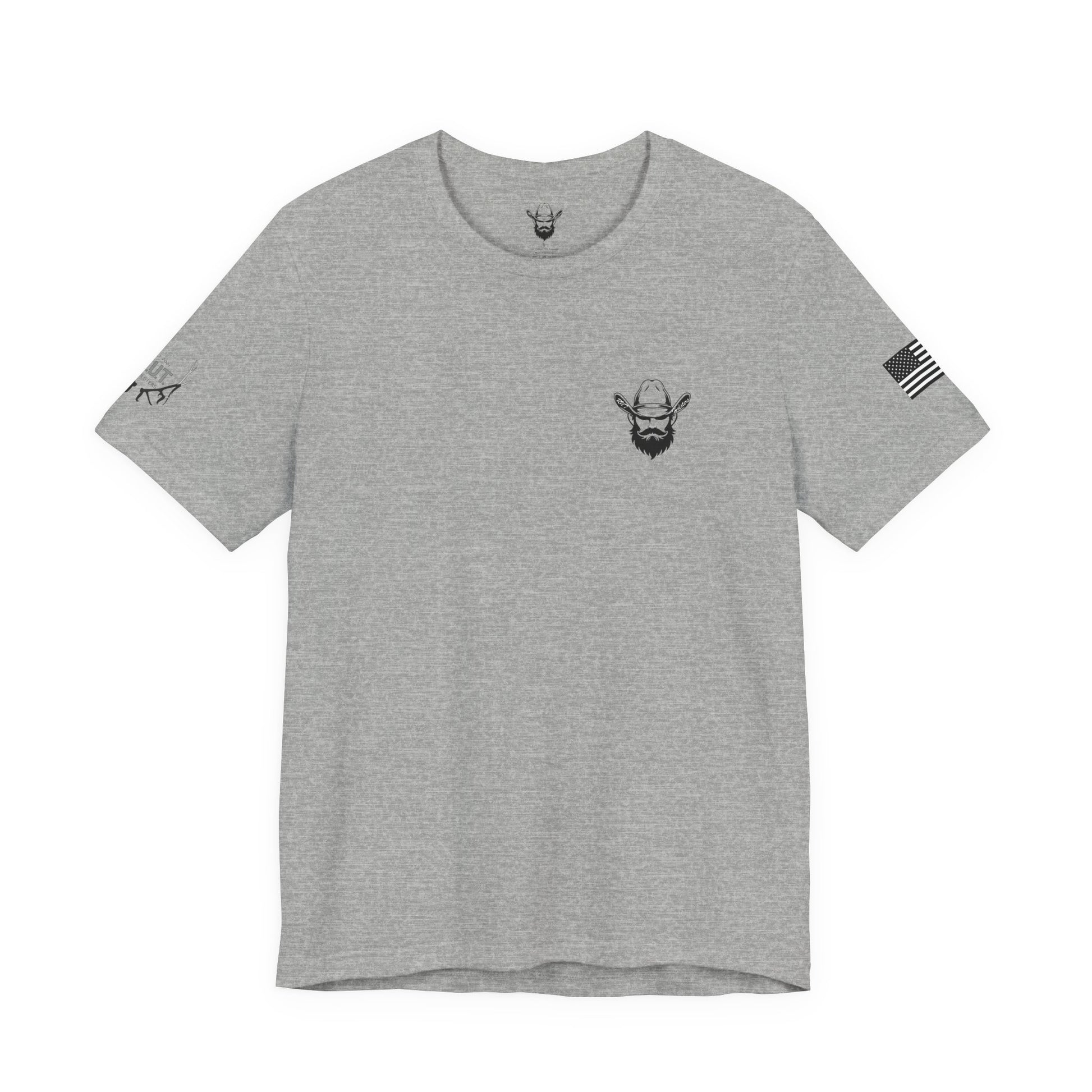 This lightweight crew-neck tee carries a quiet, confident edge — a compact emblem over the heart and a bold, sermon-like graphic across the back. Soft Airlume combed cotton drapes cleanly, letting the black ink artwork stand out: a rugged bearded figure with crossed pistols beneath a curved scripture line and the verse citation below. Subtle sleeve prints (flag on one side, small mark on the other) give it an earned, lived-in character. Wear it layered under a jacket for Sunday gatherings or alone when you want a simple, statement look that speaks to faith, resolve, and personal conviction.