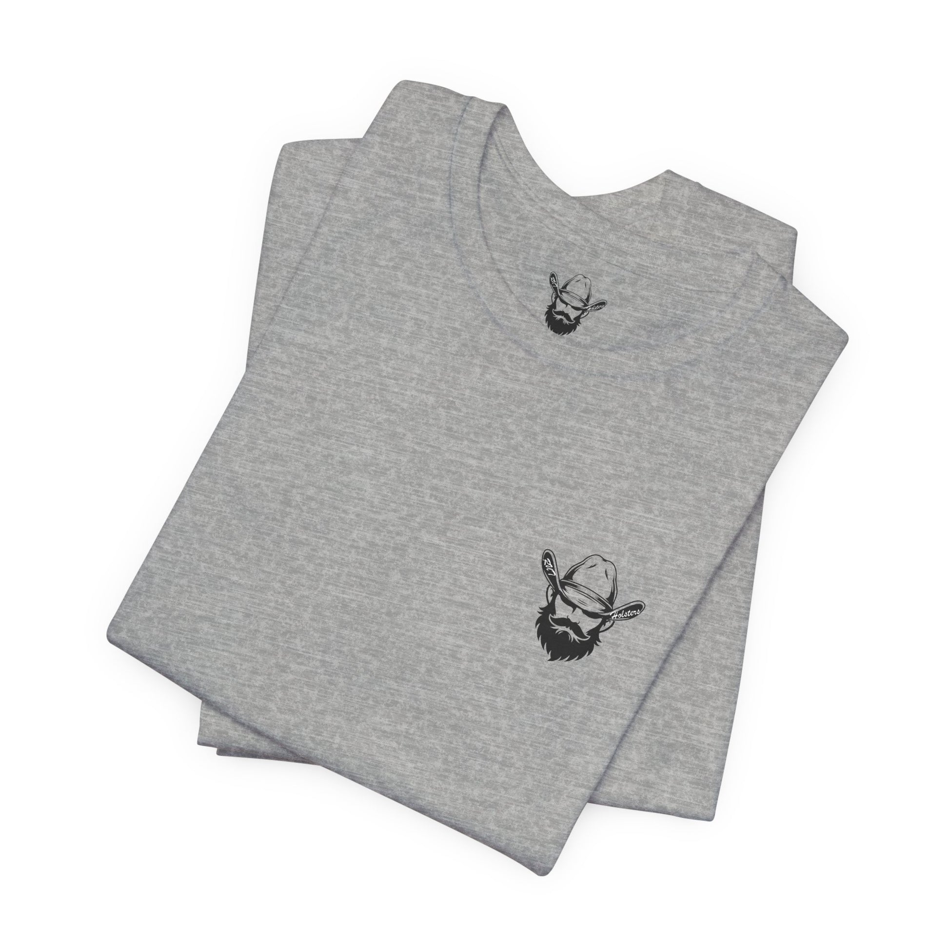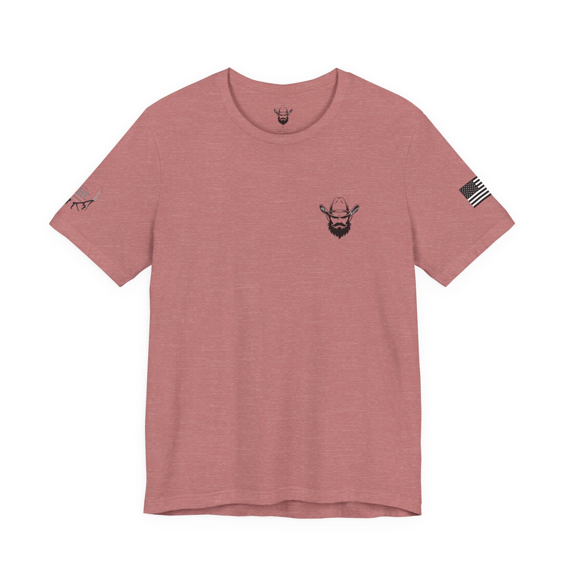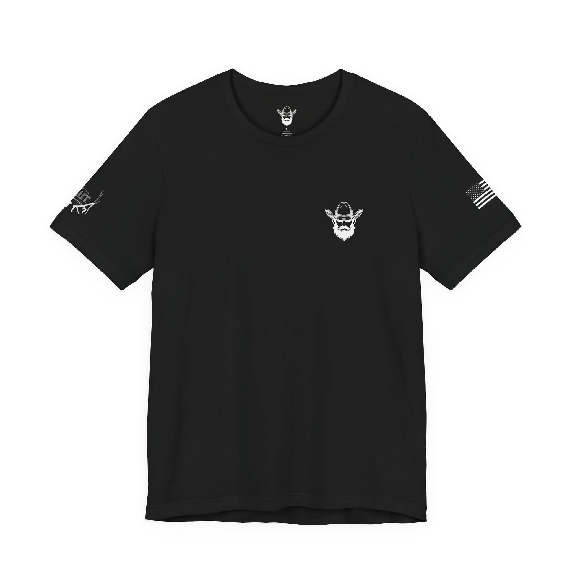 This lightweight crew-neck tee carries a quiet, confident edge — a compact emblem over the heart and a bold, sermon-like graphic across the back. Soft Airlume combed cotton drapes cleanly, letting the black ink artwork stand out: a rugged bearded figure with crossed pistols beneath a curved scripture line and the verse citation below. Subtle sleeve prints (flag on one side, small mark on the other) give it an earned, lived-in character. Wear it layered under a jacket for Sunday gatherings or alone when you want a simple, statement look that speaks to faith, resolve, and personal conviction.